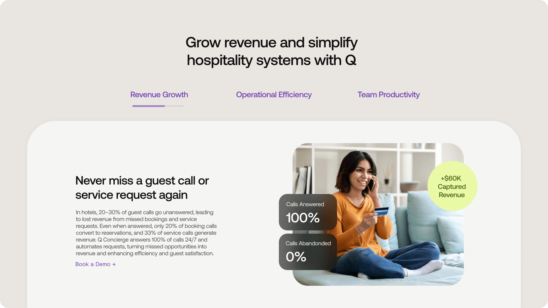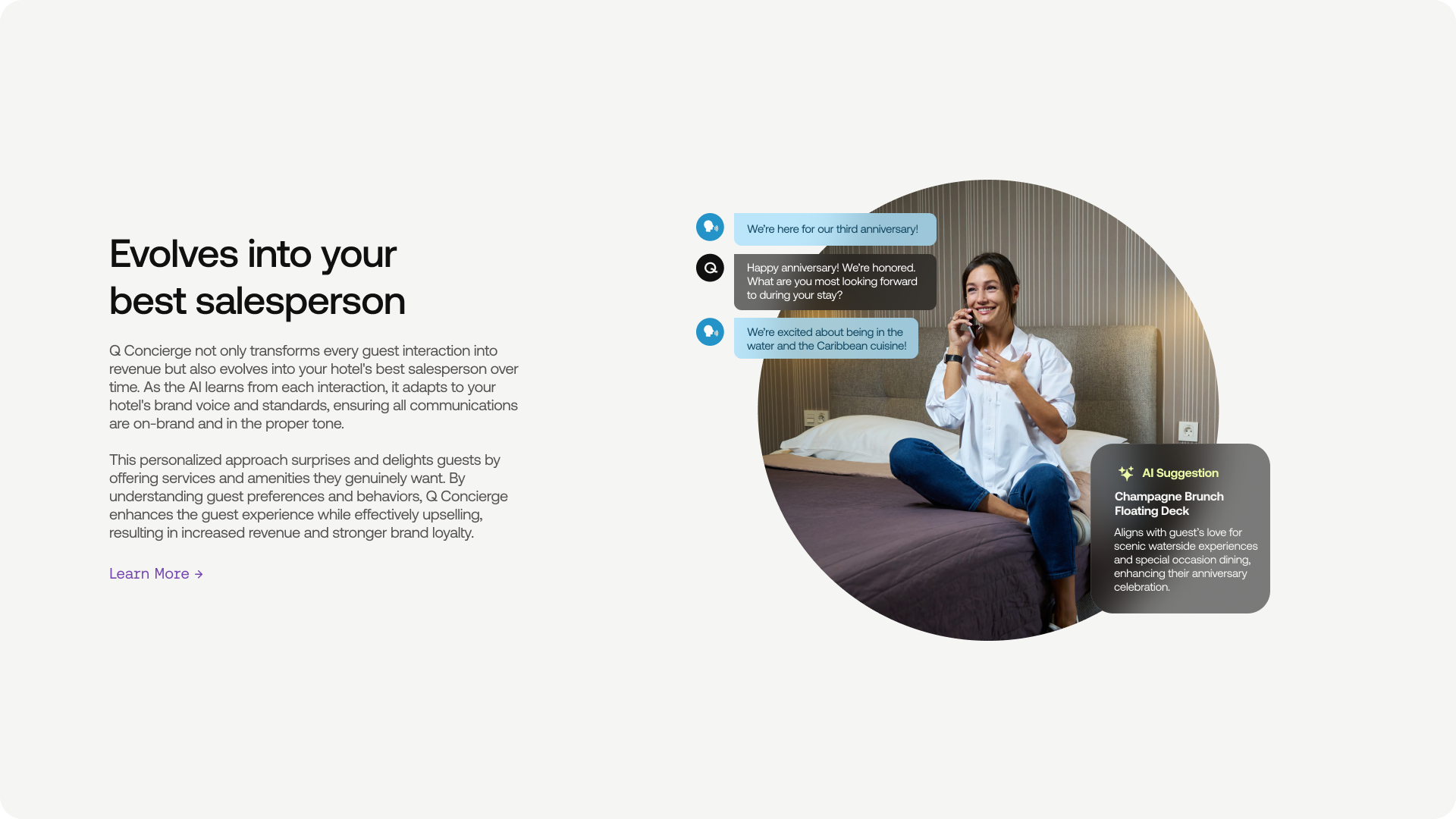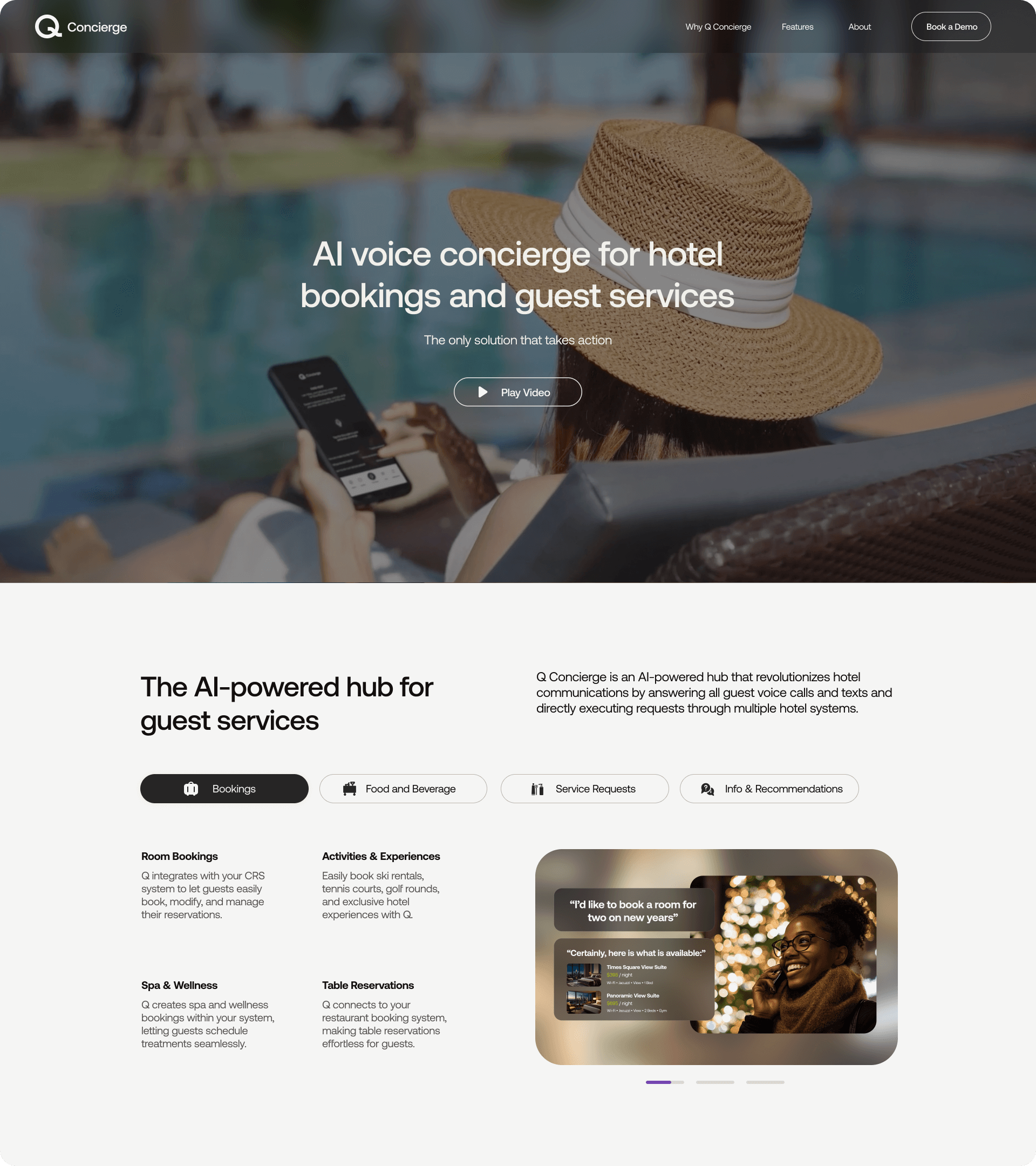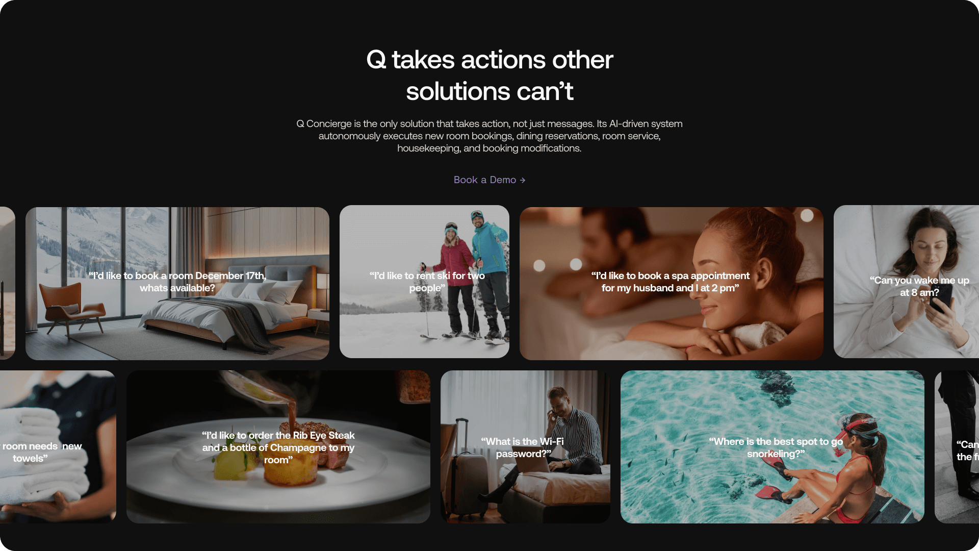 Q Concierge is an AI-driven platform that transforms hotel communications by answering guest calls and texts while seamlessly executing requests across multiple hotel systems. It resolves 96% of booking, service, and support inquiries, improving response times, operations, and guest satisfaction.